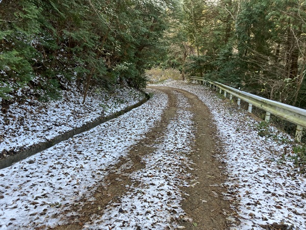 しかし、今日はいつも走っている林道に入ると、上の方は少し積もって地面が所々白くなっていた。
