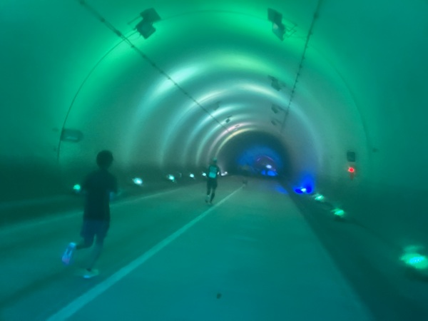 大会パンフレットの表紙にもなっている30km過ぎの大会名物のトンネル内プロジェクションマッピング